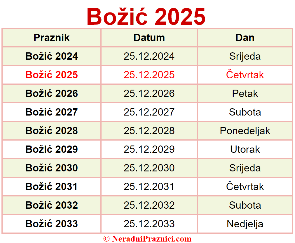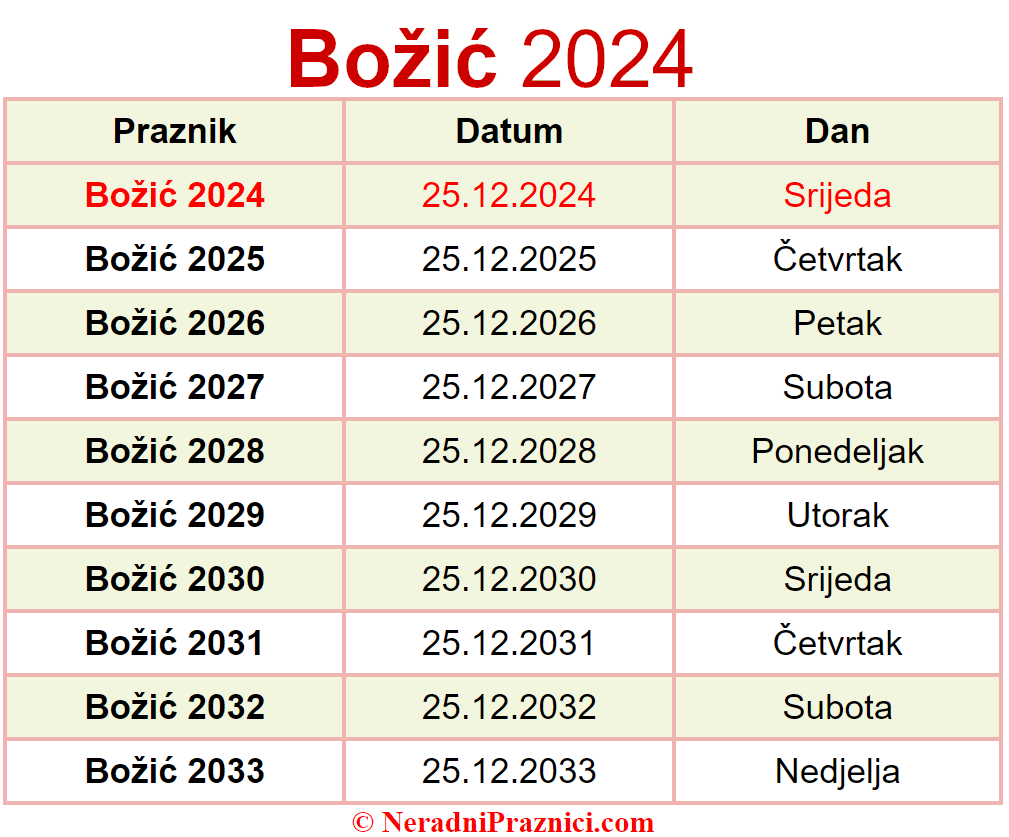 | Božić 2033 | 25.12.2033 | Nedjelja |