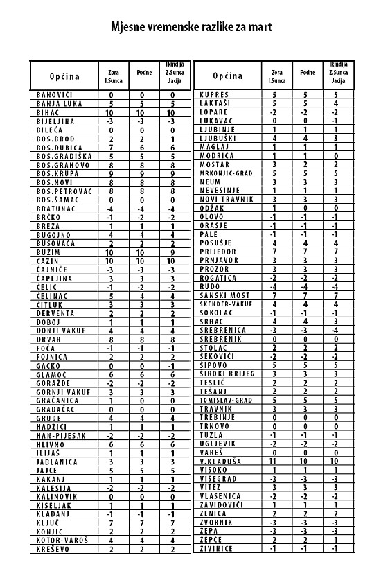 Ramazanska Vaktija za 2026. godinu važi za Sarajevo. Ispod vaktije se nalaze i slike za mjesne vremenske razlike za mjesec februar i mart po gradovima (općinama) Bosne i Hercegovine.